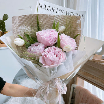 Light pink peonies elegantly swaddled in translucent paper - 4-5 stems of these glorious blooms,...