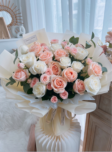 Fresh Roses wrapped with white/pink wrappings. This unique arrangement combines pink and white roses for a...
