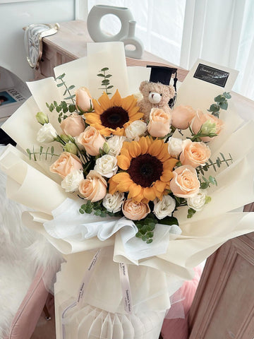 Celebrate the big day with this Beary Sunny Graduation Bouquet! The cheerful sunflower bouquet is topped...