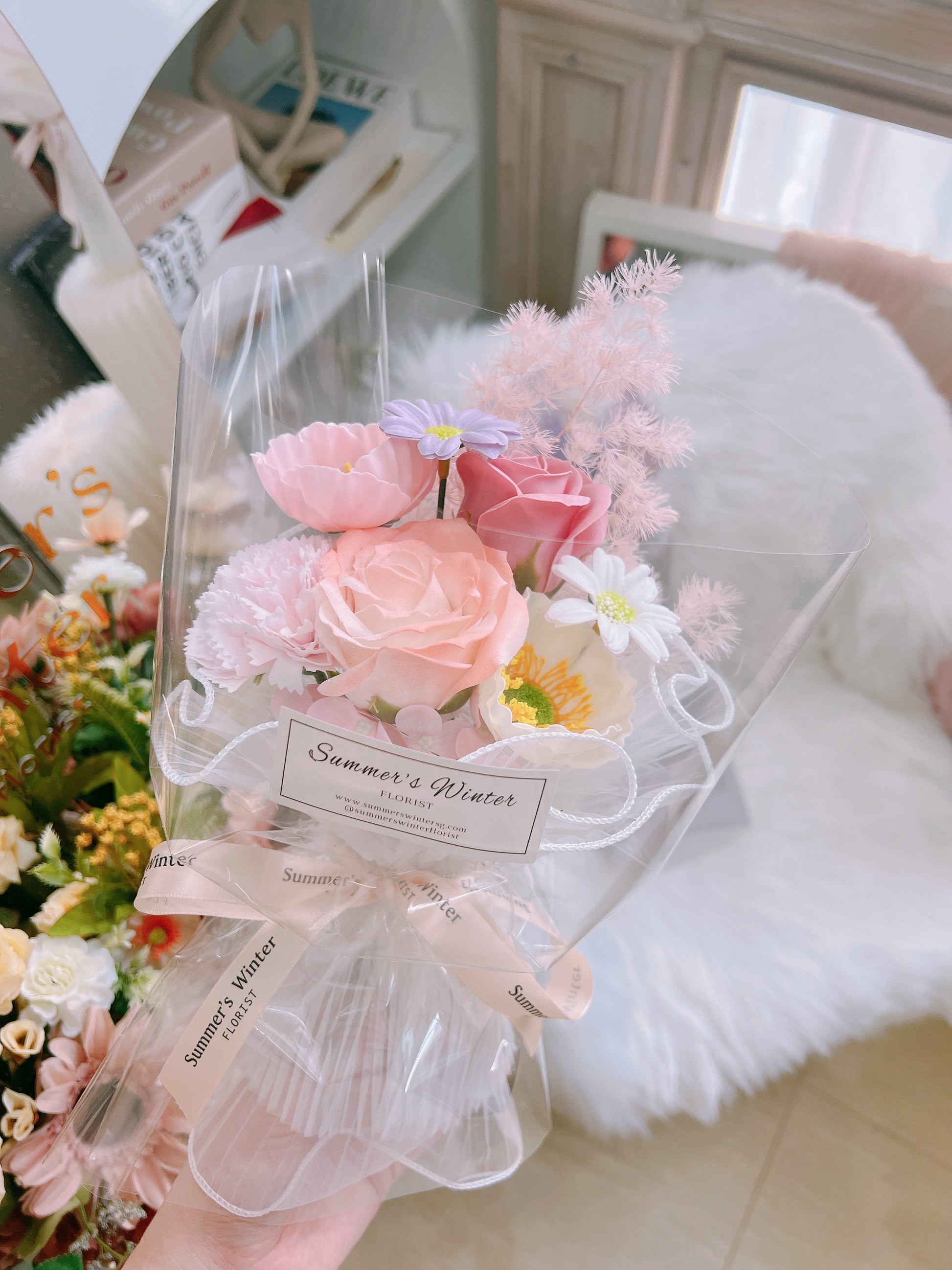 With selections of preserved, soap flowers and dried fillers, carefully designed and crafted in a transparent coloured edged paper with fairy ribbons.