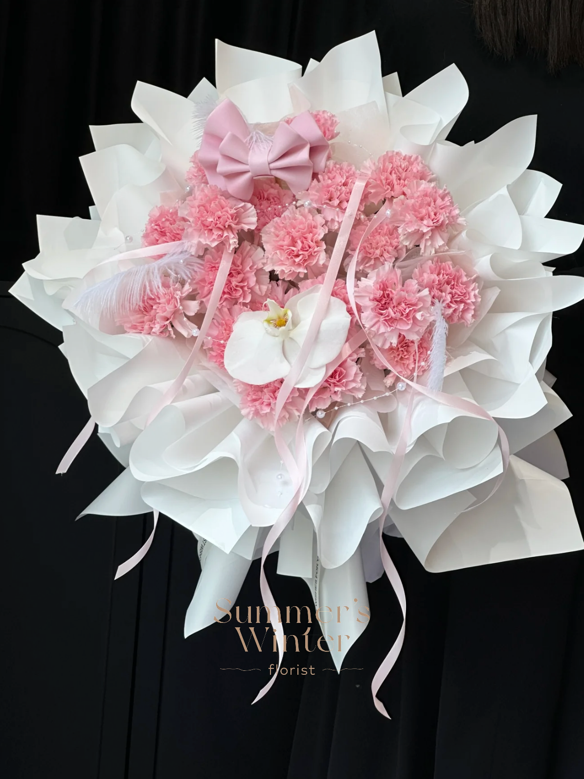 Carnation Couture is the epitome of elegance and refinement. This luxurious bouquet features lush pink carnations, their soft, ruffled petals creating a harmonious display of timeless beauty. Complemented by the delicate allure of phalaenopsis orchids, their smooth, creamy blooms add an exotic touch that elevates the entire composition.
