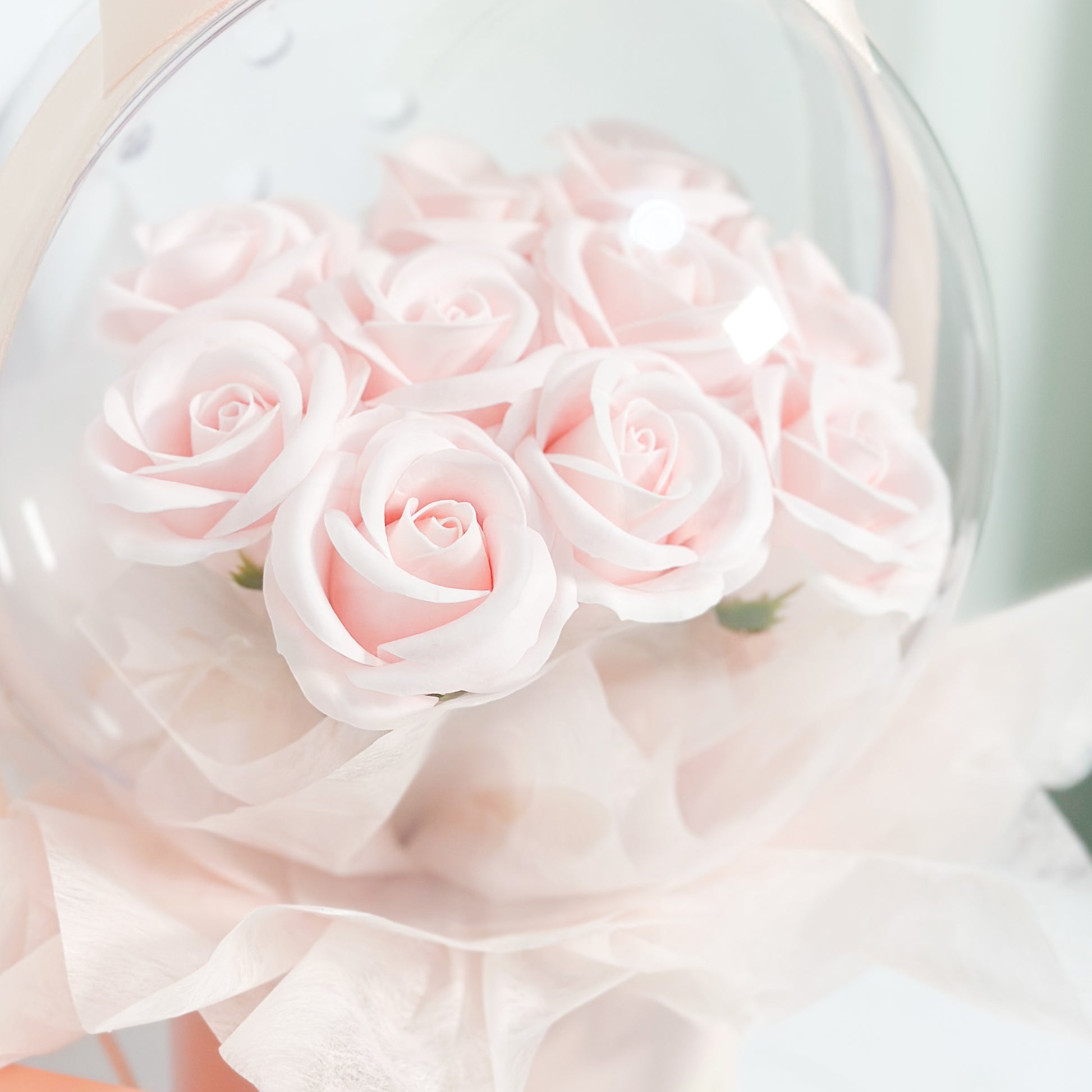 A Pink Soap Rose Crystal Ball Bouquet by Summer’s Winter Florist — a romantic blend of blush-toned soap roses encased in a crystal-clear dome, wrapped in silky ribbons and pastel florals. A symbol of admiration, gratitude, and enduring love.