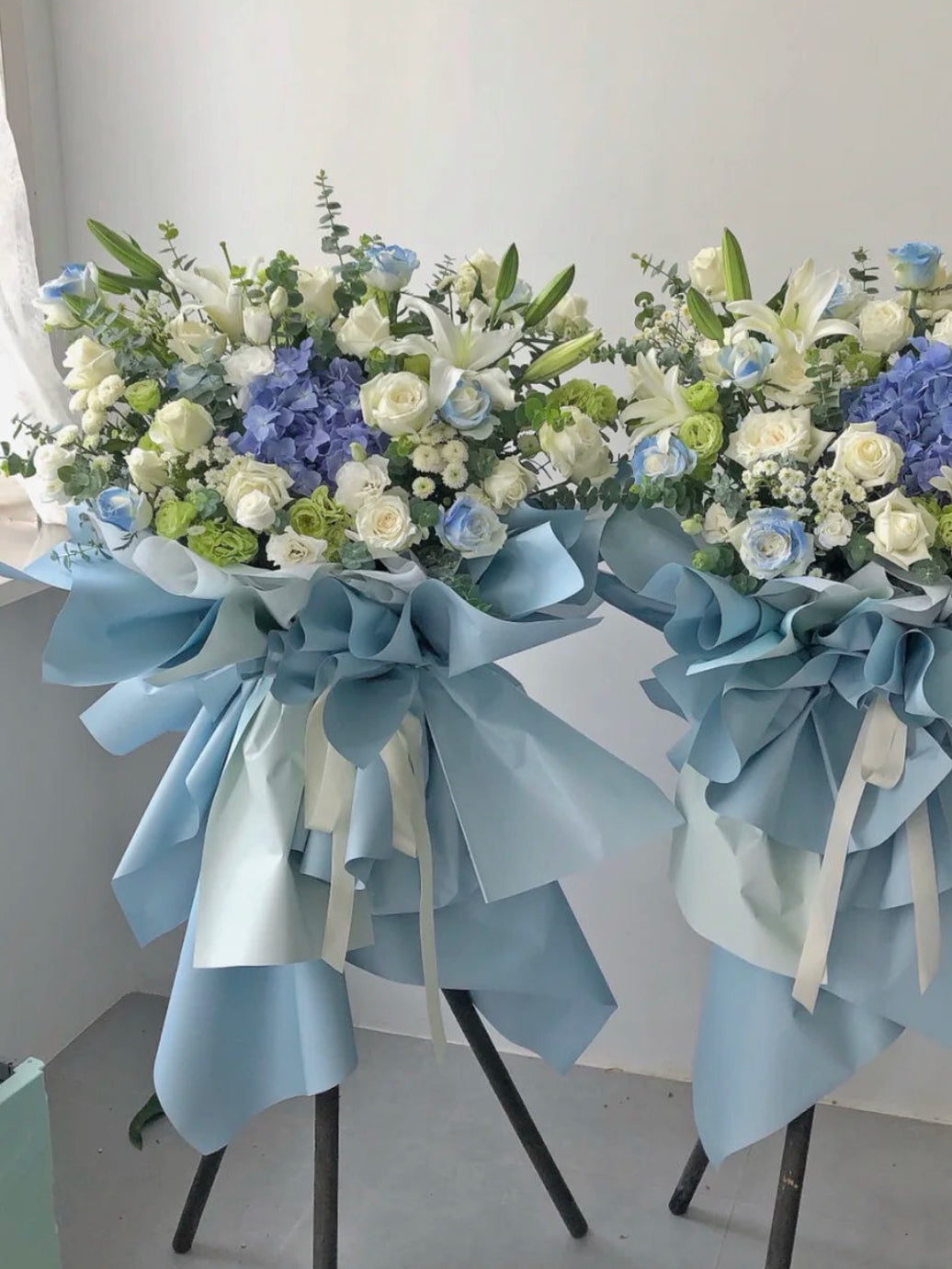 Awe onlookers with this impressive showcase - no box stands here! Blue roses, hydrangeas and lilies set the scene - and what could possibly go wrong with this head-turner? Make a grand entrance with this elegant grand opening flower stand that's sure to make a lasting impression.