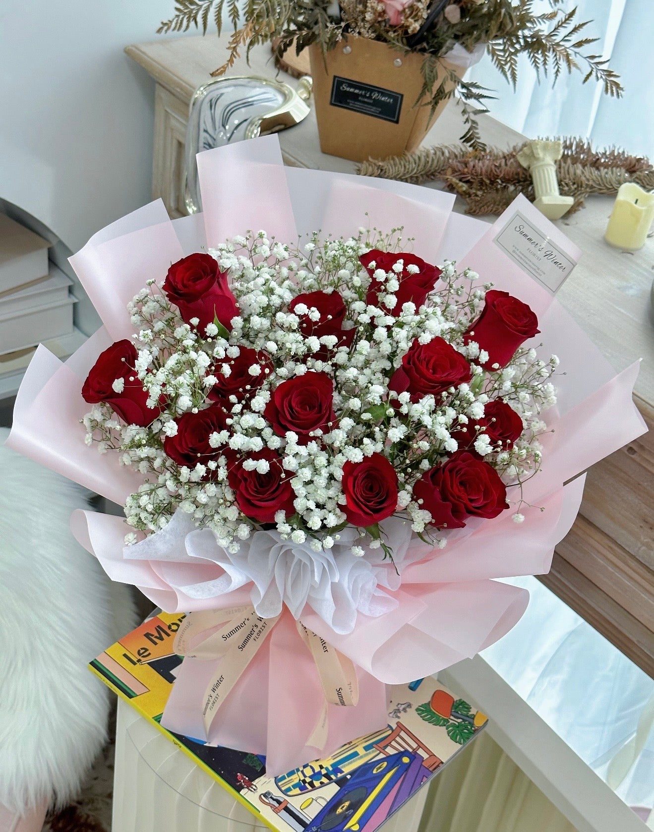 Fresh Red/Pink Roses beautifully crafted with baby’s breath fillers and wrapped in dreamy light pink wrapping. The perfect present for any special occasion, bringing beauty and delight with a bouquet of stunning roses. All wrapped up in dreamy pink style.