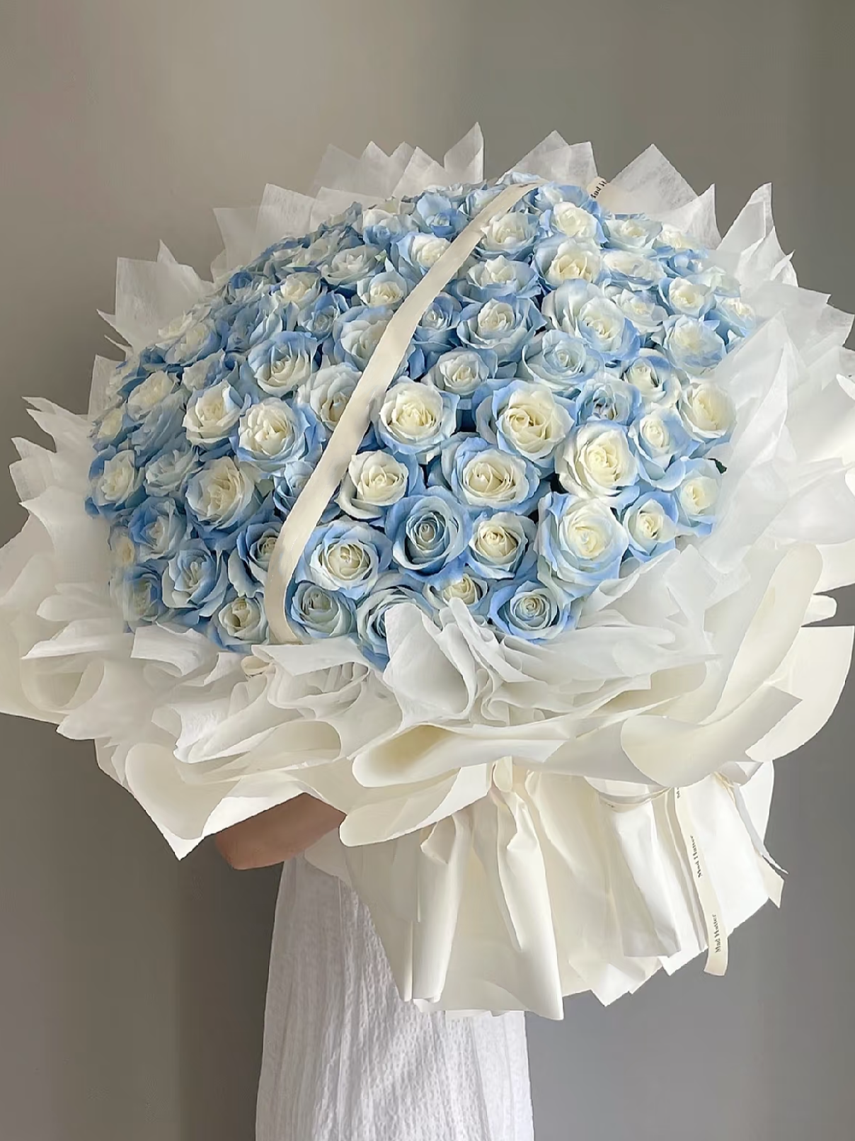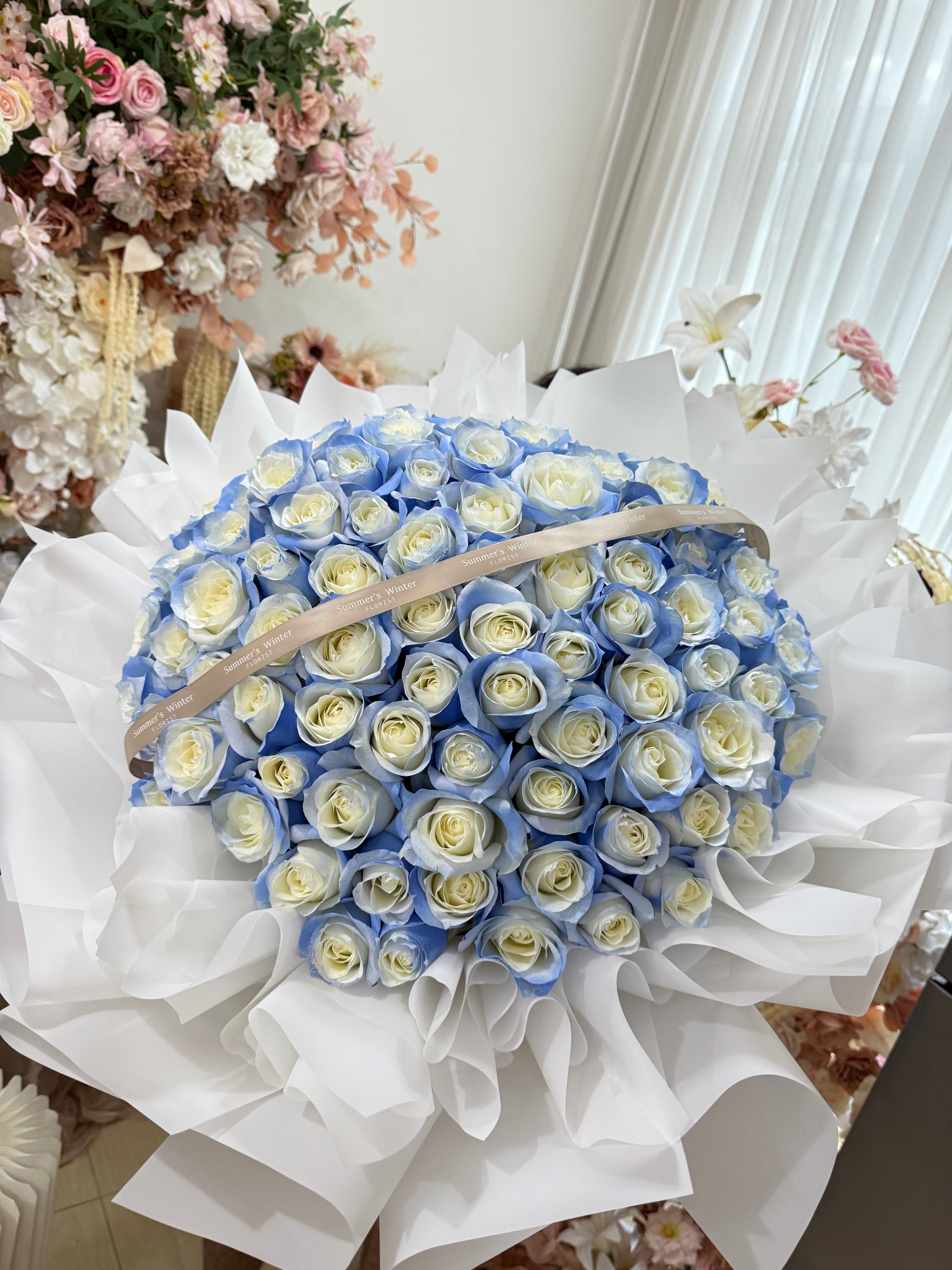 Every bloom is different and unique in its own way, we are unable to deliver the same exact bouquet replica. Lighter and darker shade of roses will be used seasonally. However, be rest assured that the overall colour hues and look of the arrangement of this 99 rose bouquet will stay the same.