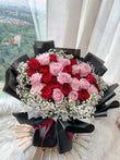Send your recipient into a blissful stupor with 23-25 delectable stalks of flowers! Joyful red and light pink roses are highlighted by sweet wisps of baby's breath, creating an enchanting color contrast, leaving them breathless!
