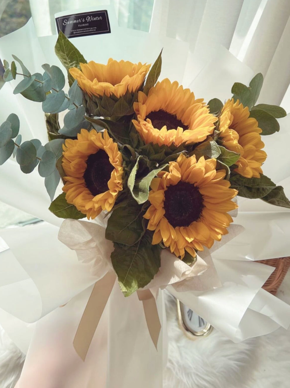 Fresh Sunflower bouquet (5 stalks) with leaves wrapped in translucent wrapping papers.
