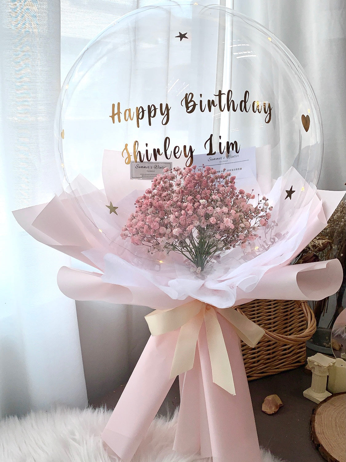 Fresh Baby's Breath Balloon Bouquet beautifully wrapped with cloud white & baby pink wrapping paper. (The wrap colour could be changed upon request without any charges, subject to availability)