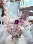 With selections of preserved rose and dried flowers, carefully designed and crafted in a glass vase.