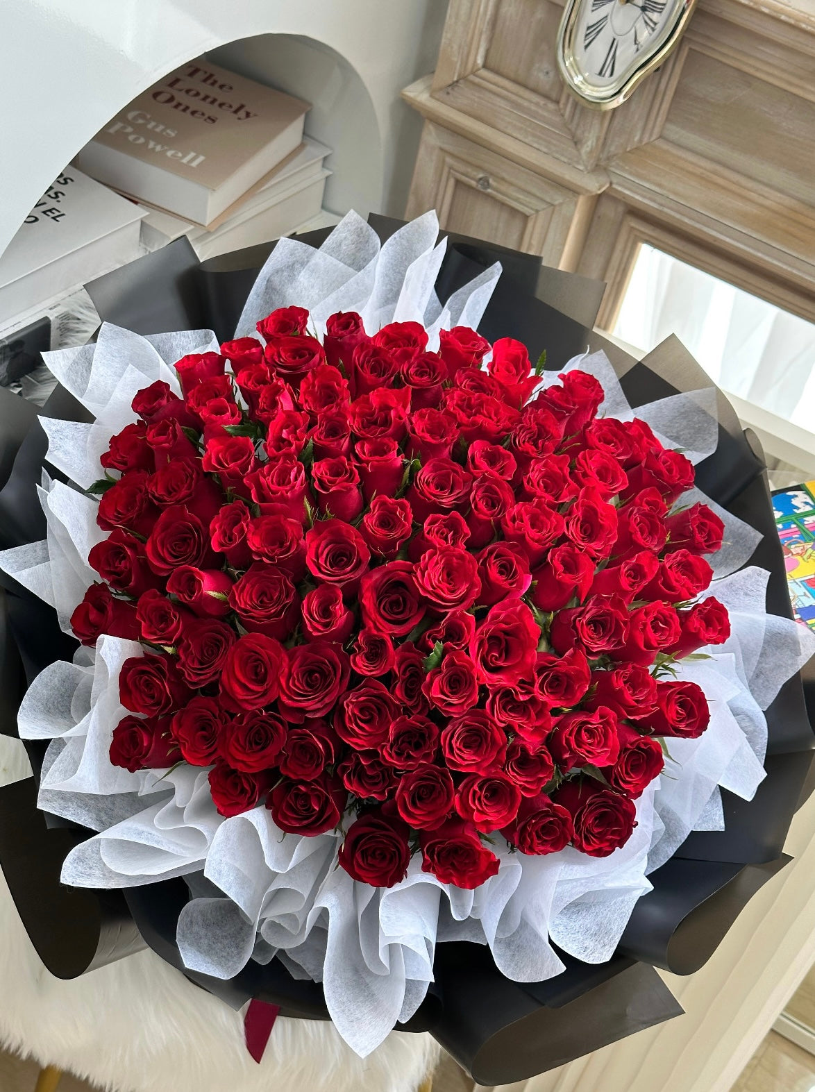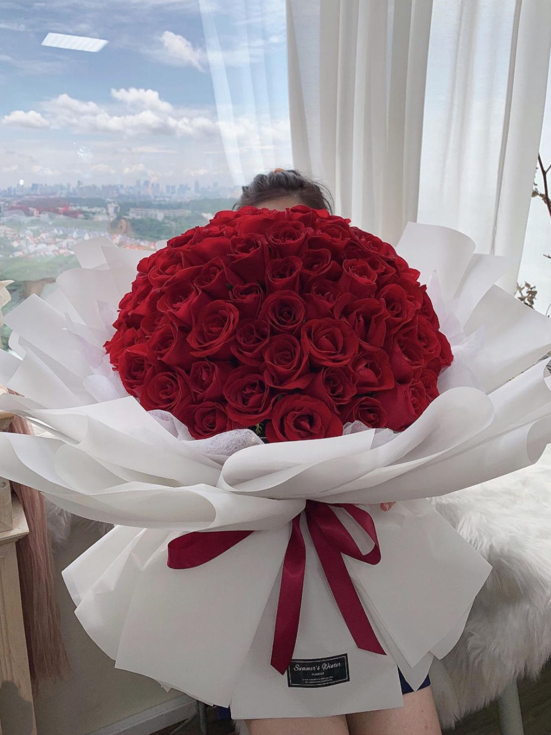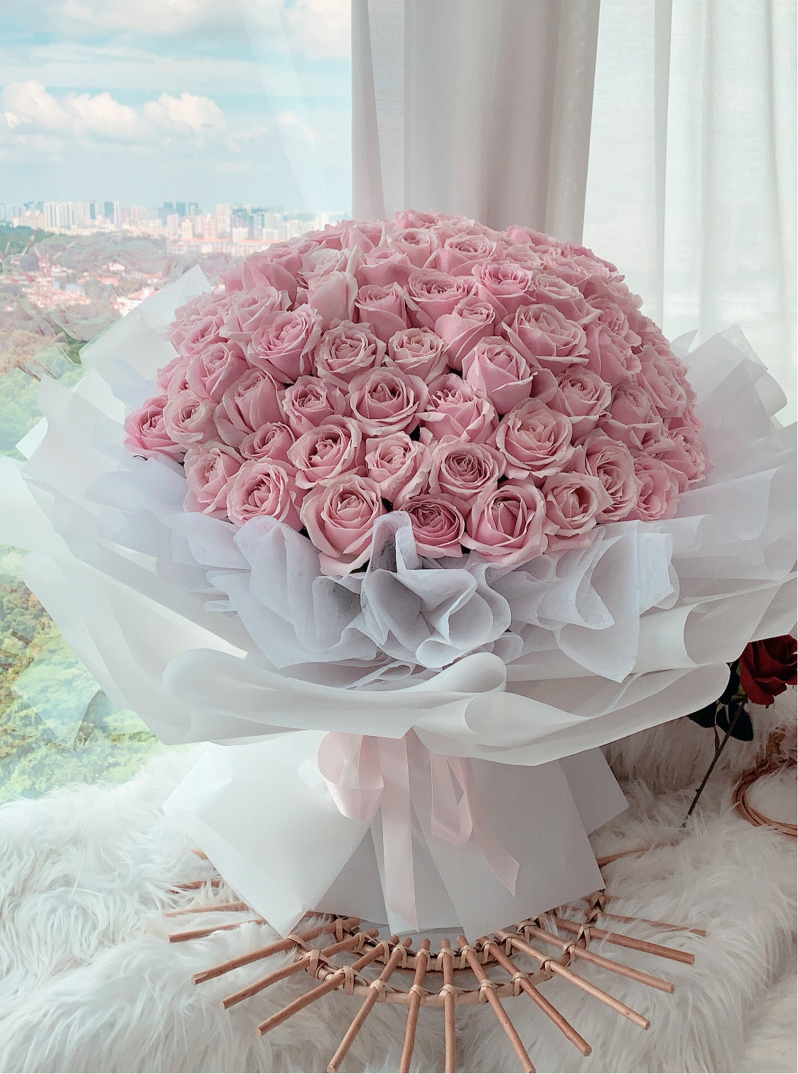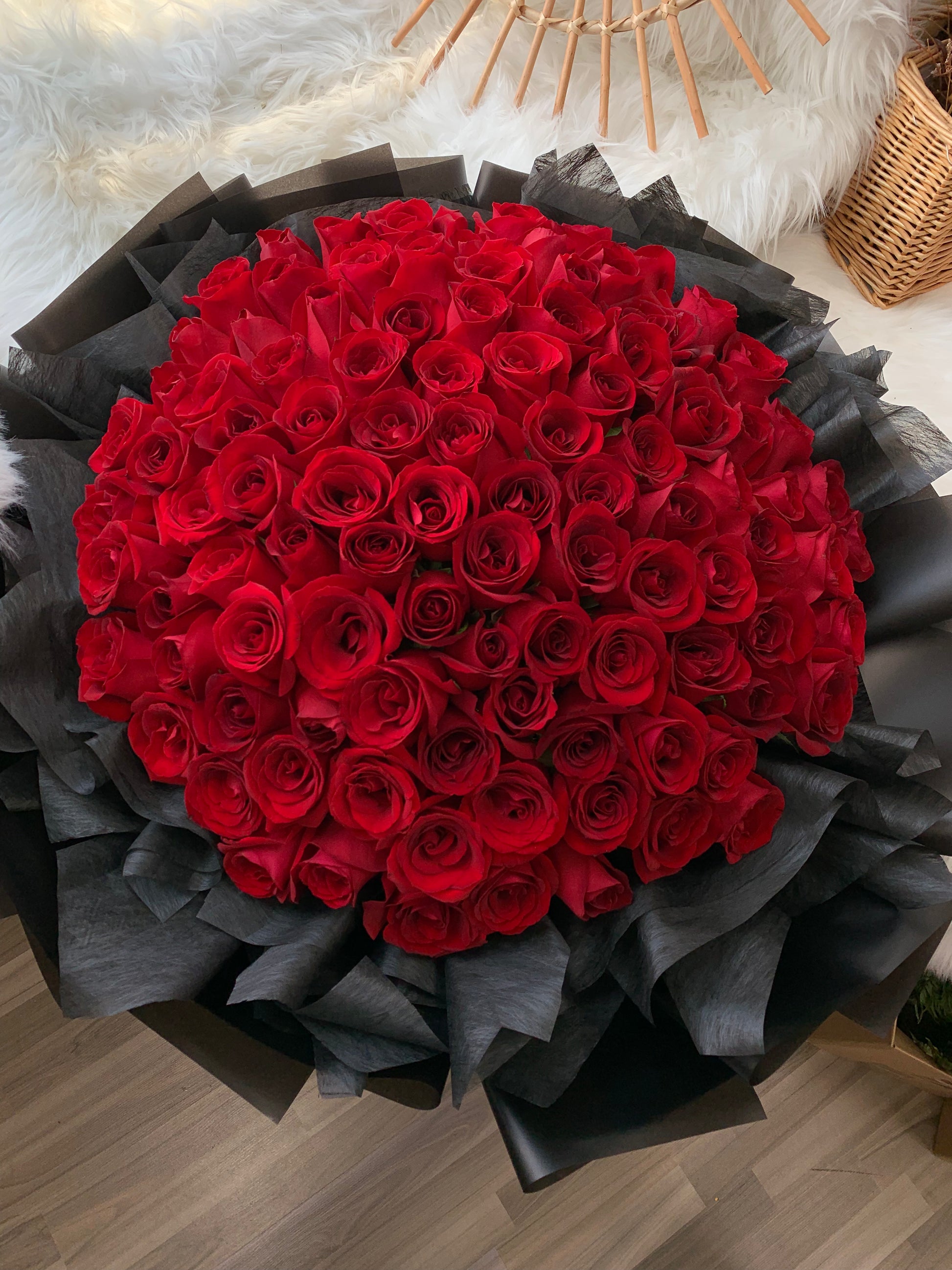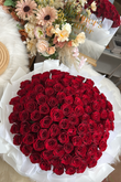 Every bloom is different and unique in its own way, we are unable to deliver the same exact bouquet replica. Lighter and darker shade of roses will be used seasonally. However, be rest assured that the overall colour hues and look of the arrangement of this 99 rose bouquet will stay the same.