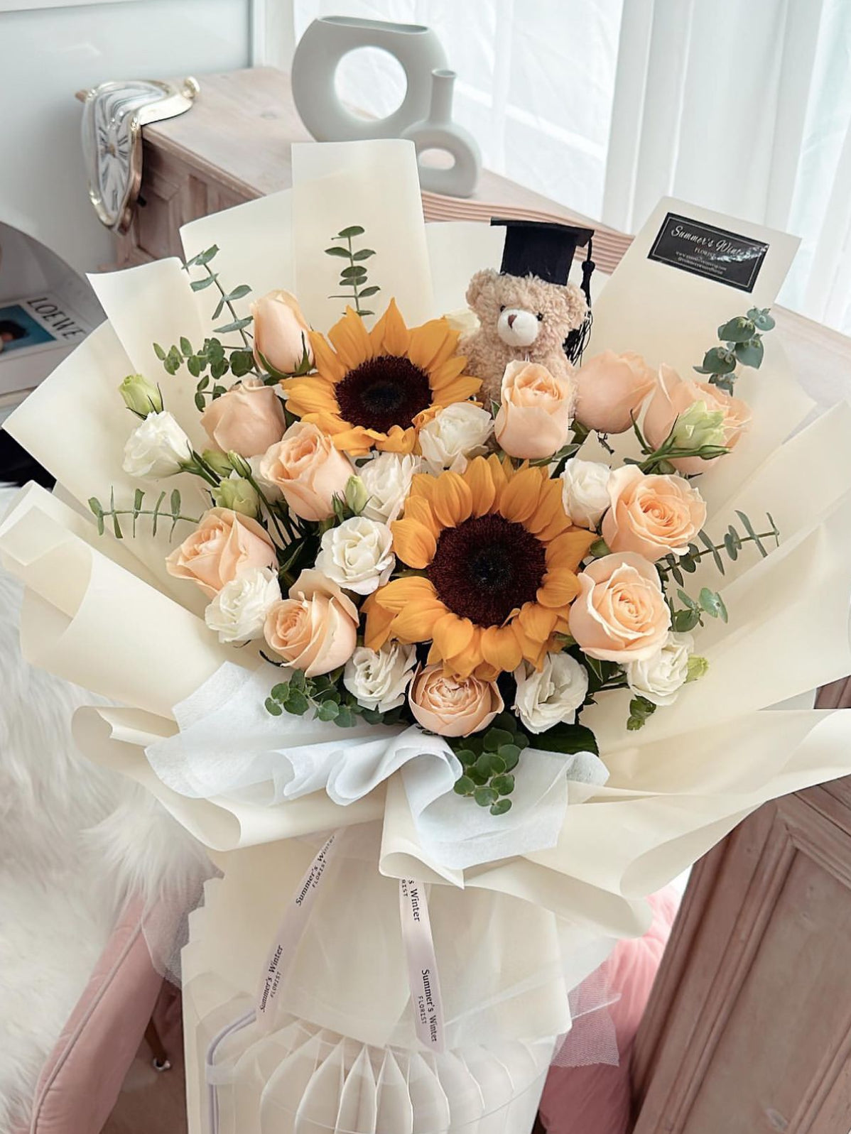 Celebrate the big day with this Beary Sunny Graduation Bouquet! The cheerful sunflower bouquet is topped with an additional graduation bear, plus a festive wrap of champagne/yellow and white tints. Perfect graduation bouquet for someone who deserves a little extra sunshine on their special day!