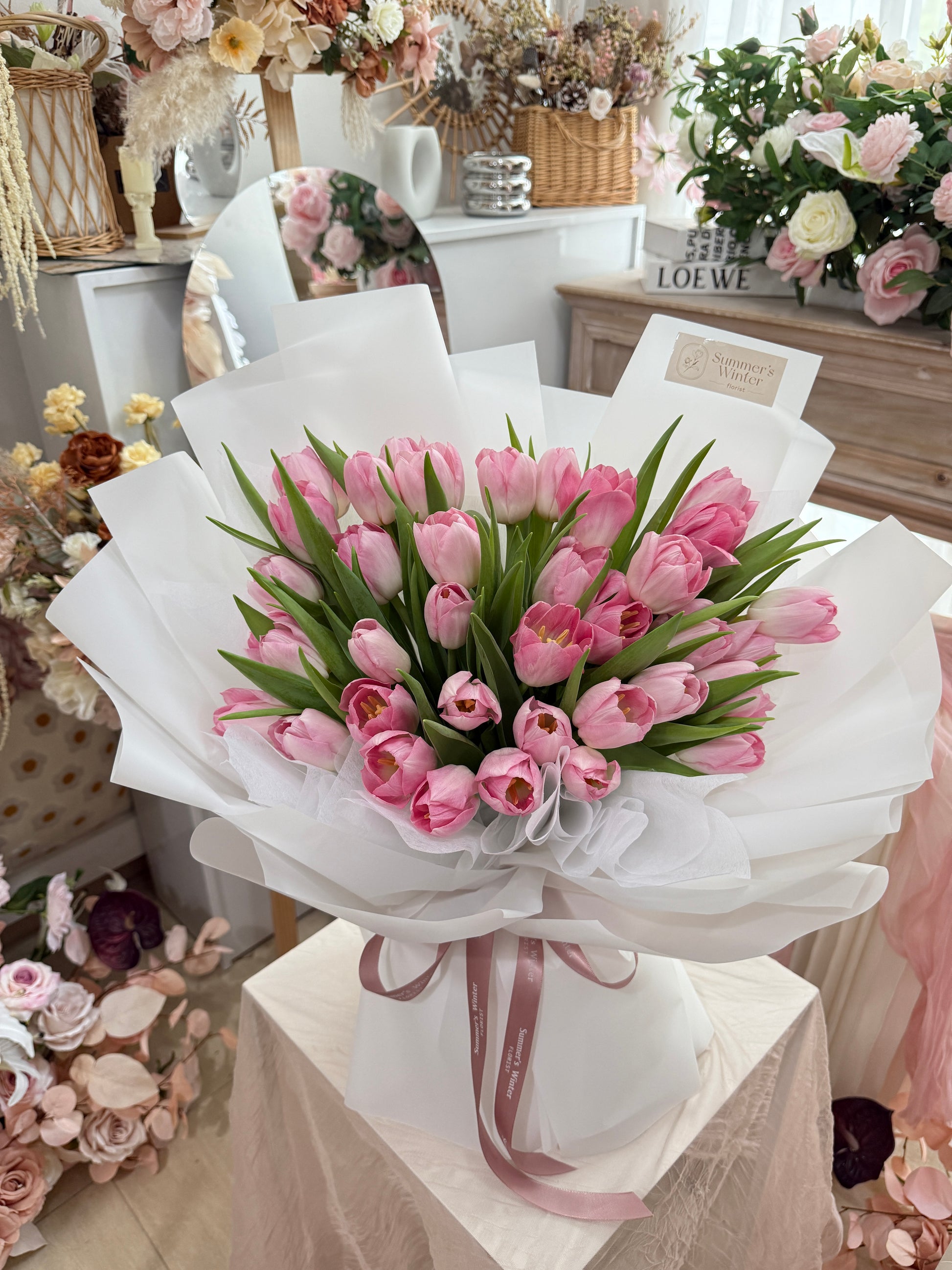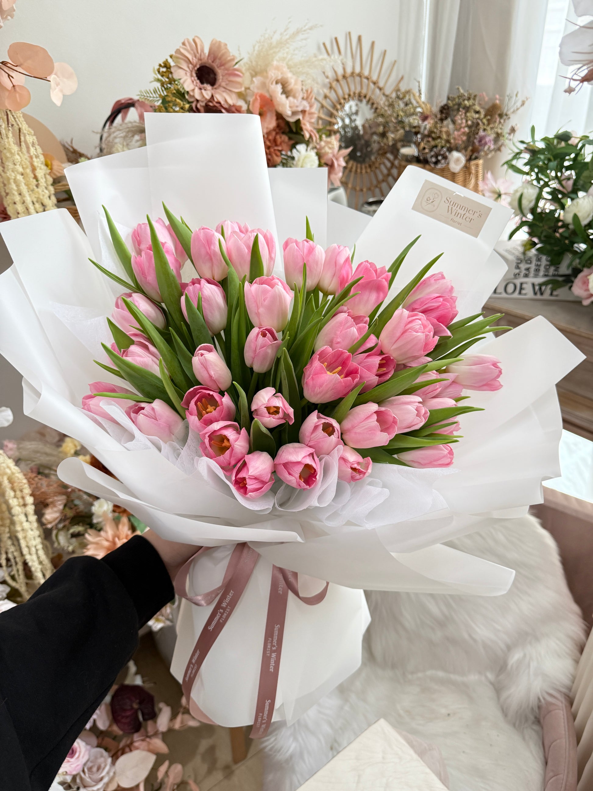 Impress your loved ones with Tulip Élan Pink, featuring 38 fresh stalks of elegant pink tulips. Each stem is carefully wrapped to create a lasting impression that will leave them in awe. (Don't forget to snap some Instagram-worthy photos!)