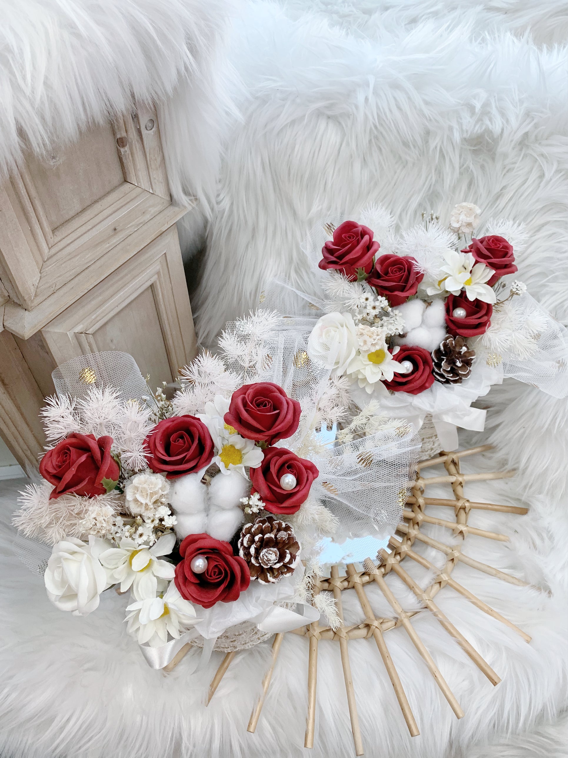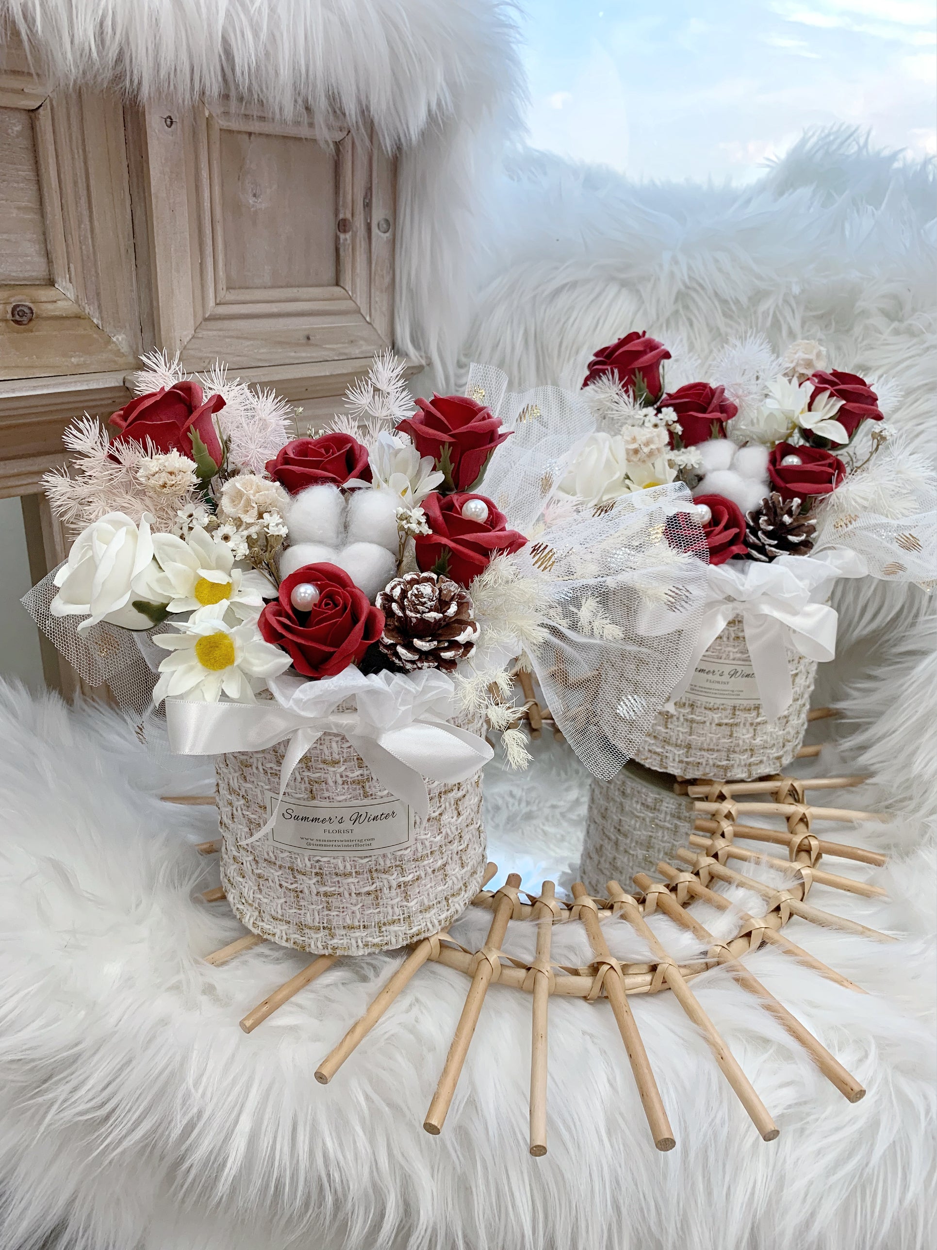 A mix of white and red tints, perfect for christmas. Box is wrapped with Tweed Material to make this season even more magical~ A product of unparalleled grace and elegance, this box of red roses adorned with white and red tints is sure to elevate your holiday experience. Its tweed material wrap adds a luxurious touch to your festivities.