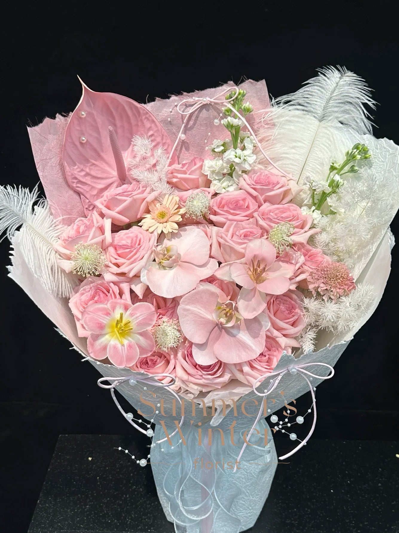 Fresh Flowers Used: Roses, Tulips, Mathiolla, Phaelaenopsis, Anthurium, Foilages, and Leaf Fillers